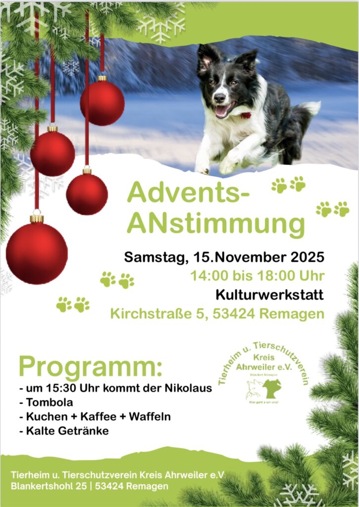AdventsAnstimmung 15. November 2025 Wir laden euch herzlich zu unserer AdventsANstimmung am Samstag, den 15. November 2025 ein!Von 14:00 bis 18:00 Uhr freuen wir uns in der Kulturwerkstatt Remagen (Kirchstraße 5) auf einen gemütlichen, vorweihnachtlichen Nachmittag/Abend mit euch. Es gibt leckeren Kuchen, frische Waffeln, Kaffee und kalte Getränke – und natürlich unsere beliebte Tombola mit tollen Preisen.Um 15:30 Uhr kommt auch der Nikolaus vorbei – ein Highlight für Groß und Klein! 🎁 Kommt vorbei, genießt mit uns die stimmungsvolle Atmosphäre und unterstützt dabei unsere Tiere im Tierheim. 💚🐶🐱 Wir freuen uns auf euren Besuch! Zurück zur Übersicht