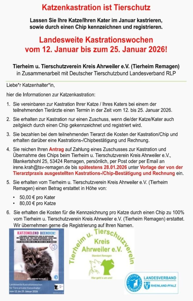 Die jährlichen landesweiten Kastrationswochen (12.01.–25.01.2026) stehen wieder bevor!