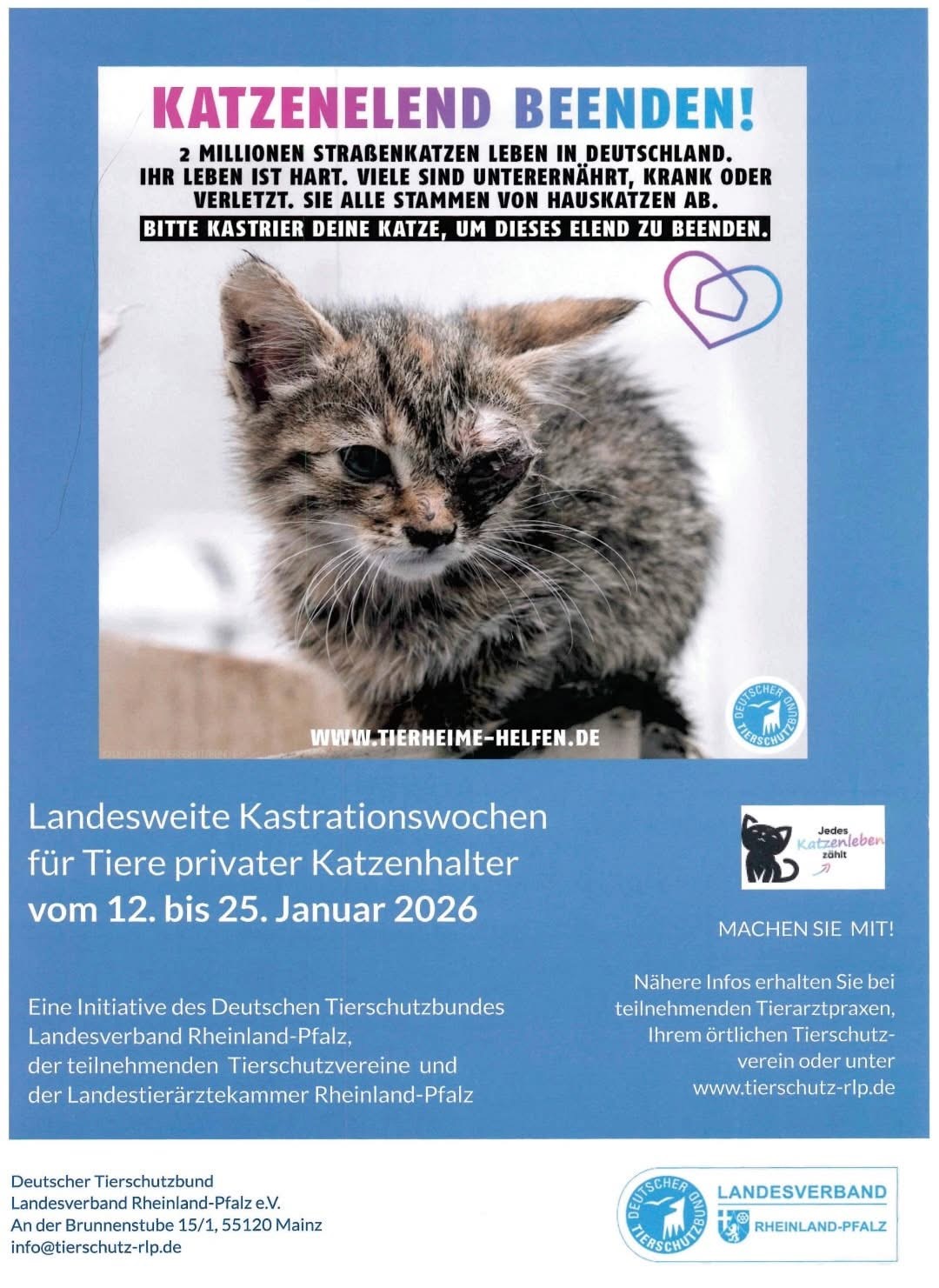 Die jährlichen landesweiten Kastrationswochen (12.01.–25.01.2025) stehen wieder bevor!Nutzt diese Gelegenheit und vereinbart einen Termin bei einem der teilnehmenden Tierärzt*innen. Für jede in diesem Zeitraum durchgeführte Kastration erhaltet ihr einen Zuschuss von uns – 50 € pro Kater und 80 € pro Katze.Die Kosten für die Kennzeichnung mittels Chip übernehmen wir sogar vollständig. Das schont nicht nur euren Geldbeutel, sondern hilft auch aktiv dabei, das Katzenleid in eurer Umgebung zu verringern. Das Angebot richtet sich nicht nur an Katzenhalterinnen, sondern auch an **Betreuerinnen von Katzenkolonien**. Bitte übernehmt Verantwortung für eure Tiere und helft mit, die nächste Kittenflut zu verhindern. 🐾Den genauen Ablauf sowie eine Übersicht der teilnehmenden Tierärzt*innen findet ihr in den Beiträgen. Vielen Dank für eure Unterstützung und Teilnahme!